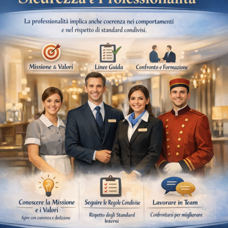 Accogliere gli ospiti in modo sicuro e professionale significa unire attenzione, competenza e sensibilità. La sicurezza crea fiducia, mentre la professionalità genera valore umano e qualità percepita. Investire in questi aspetti è un segno di rispetto verso gli ospiti e di orgoglio per il proprio lavoro. Solo così l’accoglienza diventa un’esperienza autentica, capace di lasciare un ricordo positivo e duraturo in chiunque varchi la soglia della nostra struttura.